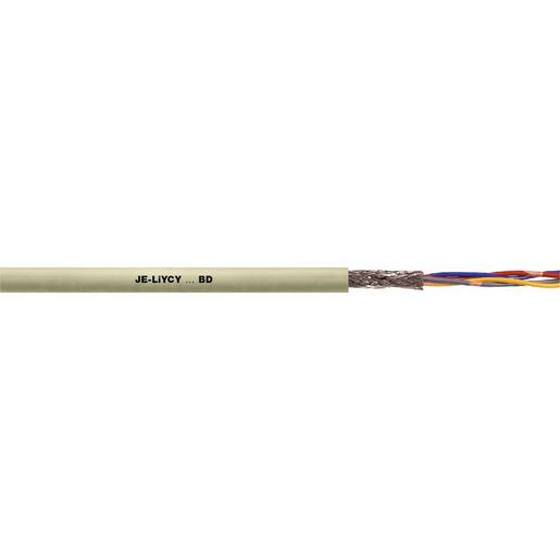 Verbindungsleitung in der Elektronik, in der Meß-, Steuer-, Regel- und Signaltechnik, Außerdem wird diese Leitung auch als Impuls- und Datenübertragungsleitung verwendet, JE-LiYCY…BD hat sich auch als Anschlussleitung für Fernsprechanlagen wie z.B. Ruf- und Gegensprechanlagen sehr bewährt, Zur festen Verlegung auf und unter Putz in trockenen und feuchten Räumen, Im Freien kann das Kabel nur unter Putz verlegt werden, Anwendbar für Maxi TERMI-POINT® Verdrahtung, Gesamtschirm minimiert elektrische Störeinflüsse, Entkopplung von Stromkreisen durch TP-Aufbau (Über- und Nebensprecheffekte), 7-drähtige Litze aus blanken Kupferdrähten, Aderisolation aus PVC, 2 Adern zum Paar und 4 Paare zum Bündel verseilt (bei 2 x 2 x 0,5 als Sternvierer), Bündel in Lagen verseilt, Folienbewicklung, Abschirmgeflecht aus verzinnten Kupferdrähten, Außenmantel aus PVC Außenmantelfarbe: kieselgrau (RAL 7032), Gemäß DIN VDE 0815 Bauart JE-LiYCY…BD, JE-LiYCY…BD EB: Für eigensichere Stromkreise (Zündschutzart i – Eigensicherheit) nach IEC 60079-14:2013 / EN 60079-14:2014 / VDE 0165-1:2014, Abschnitt 16.2.2, Die 2-paarige Version (2x2x0,5) ist zum Stern-Vierer verseilt, Flammwidrig nach IEC 60332-1-2,