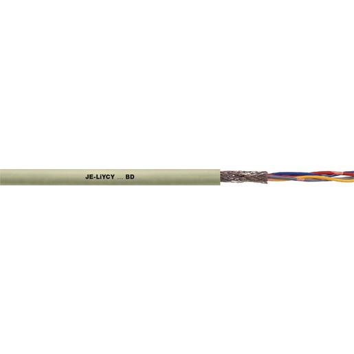 Verbindungsleitung in der Elektronik, in der Meß-, Steuer-, Regel- und Signaltechnik, Außerdem wird diese Leitung auch als Impuls- und Datenübertragungsleitung verwendet, JE-LiYCY…BD hat sich auch als Anschlussleitung für Fernsprechanlagen wie z.B. Ruf- und Gegensprechanlagen sehr bewährt, Zur festen Verlegung auf und unter Putz in trockenen und feuchten Räumen, Im Freien kann das Kabel nur unter Putz verlegt werden, Anwendbar für Maxi TERMI-POINT® Verdrahtung, Gesamtschirm minimiert elektrische Störeinflüsse, Entkopplung von Stromkreisen durch TP-Aufbau (Über- und Nebensprecheffekte), 7-drähtige Litze aus blanken Kupferdrähten, Aderisolation aus PVC, 2 Adern zum Paar und 4 Paare zum Bündel verseilt (bei 2 x 2 x 0,5 als Sternvierer), Bündel in Lagen verseilt, Folienbewicklung, Abschirmgeflecht aus verzinnten Kupferdrähten, Außenmantel aus PVC Außenmantelfarbe: kieselgrau (RAL 7032), Gemäß DIN VDE 0815 Bauart JE-LiYCY…BD, JE-LiYCY…BD EB: Für eigensichere Stromkreise (Zündschutzart i – Eigensicherheit) nach IEC 60079-14:2013 / EN 60079-14:2014 / VDE 0165-1:2014, Abschnitt 16.2.2, Die 2-paarige Version (2x2x0,5) ist zum Stern-Vierer verseilt, Flammwidrig nach IEC 60332-1-2,