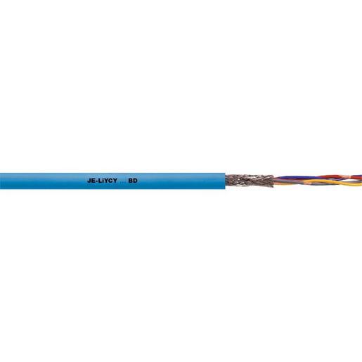 Verbindungsleitung in der Elektronik, in der Meß-, Steuer-, Regel- und Signaltechnik, Außerdem wird diese Leitung auch als Impuls- und Datenübertragungsleitung verwendet, JE-LiYCY…BD hat sich auch als Anschlussleitung für Fernsprechanlagen wie z.B. Ruf- und Gegensprechanlagen sehr bewährt, Zur festen Verlegung auf und unter Putz in trockenen und feuchten Räumen, Im Freien kann das Kabel nur unter Putz verlegt werden, Anwendbar für Maxi TERMI-POINT® Verdrahtung, Gesamtschirm minimiert elektrische Störeinflüsse, Entkopplung von Stromkreisen durch TP-Aufbau (Über- und Nebensprecheffekte), 7-drähtige Litze aus blanken Kupferdrähten, Aderisolation aus PVC, 2 Adern zum Paar und 4 Paare zum Bündel verseilt (bei 2 x 2 x 0,5 als Sternvierer), Bündel in Lagen verseilt, Folienbewicklung, Abschirmgeflecht aus verzinnten Kupferdrähten, Außenmantel aus PVC Außenmantelfarbe: himmelblau (RAL 5015), Gemäß DIN VDE 0815 Bauart JE-LiYCY…BD, JE-LiYCY…BD EB: Für eigensichere Stromkreise (Zündschutzart i – Eigensicherheit) nach IEC 60079-14:2013 / EN 60079-14:2014 / VDE 0165-1:2014, Abschnitt 16.2.2, Die 2-paarige Version (2x2x0,5) ist zum Stern-Vierer verseilt, Flammwidrig nach IEC 60332-1-2,