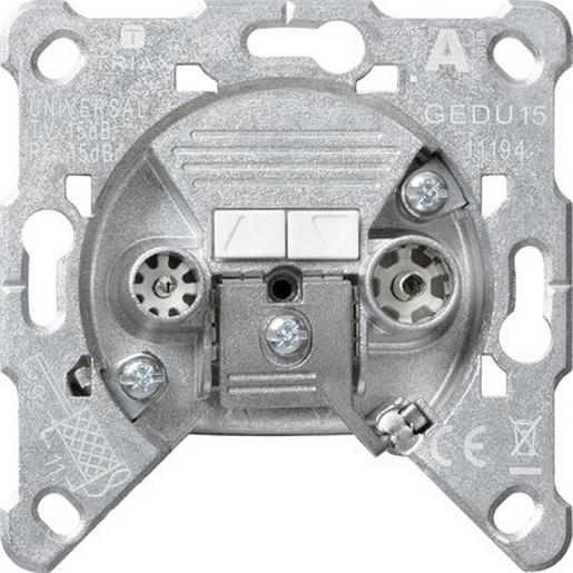 Einsatz Antennensteckdose (GEDU 15) Merkmale: Als Durchgangsdose verwendbar. Zum Einsatz in Gemeinschafts-Antennenanlagen mit mehreren Dosen (Baumstruktur). An beiden Anschlüssen steht das komplette Signalspektrum von 4 bis 2400 MHz zur Verfügung. Hinweise : Nur für Schraubbefestigung. Achtung! Bauraum für Stecker und Biegeradien beachten. Bei Einsätzen mit Kupplungen beachten: Nicht für Kanalinstallation und Standardgerätedose geeignet. Anschluss mit Winkelsteckern empfohlen. Bei Verwendung dieser Steckvorrichtungen besteht für angeschlossene Geräte eine Leistungsbegrenzung von 15 Watt. Installationsempfehlung: Kaiser Elektronic-Dosen Unterputz-Montage: Kaiser Best.-Nr.: 1068-02 Hohlwandmontage: Kaiser Best.-Nr.: 9062-94 Betoninstallation: Kaiser Best.-Nr.: 1268-40 Geeignet für terrestrischen Empfang, BK- und Satellitenempfangsanlagen.