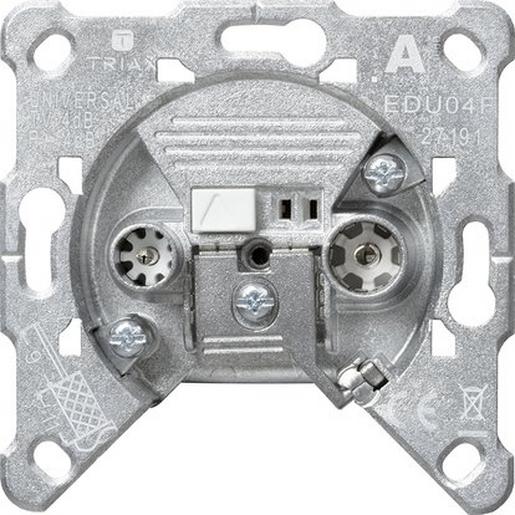 Einsatz Antennensteckdose (EDU 04 F) Merkmale: Als Einzeldose einsetzbar. An beiden Anschlüssen steht das komplette Signalspektrum von 4 bis 2400 MHz zur Verfügung. Über den TV-Anschluss ist die Gleichspannungsübertragung (max. DC 24 V 500 mA) zu einer Satellitenantenne möglich. Hinweise : Nur für Schraubbefestigung. Achtung! Bauraum für Stecker und Biegeradien beachten. Bei Einsätzen mit Kupplungen beachten: Nicht für Kanalinstallation und Standardgerätedose geeignet. Anschluss mit Winkelsteckern empfohlen. Bei Verwendung dieser Steckvorrichtungen besteht für angeschlossene Geräte eine Leistungsbegrenzung von 15 Watt. Installationsempfehlung: Kaiser Elektronic-Dosen Unterputz-Montage: Kaiser Best.-Nr.: 1068-02 Hohlwandmontage: Kaiser Best.-Nr.: 9062-94 Betoninstallation: Kaiser Best.-Nr.: 1268-40 Zum Einsatz in Einzelantennenanlagen und für Gemeinschaftsantennenanlagen, BK-und Satelliten-Hausverteilanlagen an entkoppelten Stichleitungen.