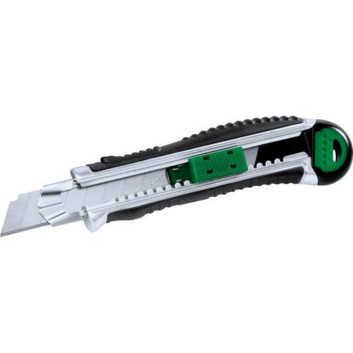 schwere Ausführung Gehäuse aus Zink – Druckguß ergonomischer Softgriff integriertes selbstladendes 5-fach Magazin automatischer Klingenstop zusätzlicher Klingenfeststeller (nicht 9 mm-Version) Profi-Cuttermesser 9 mm Klingenbreite