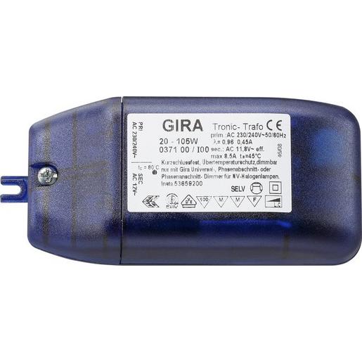 Tronic-Trafo universal, elektronischer Transformator für NV-Halogenlampen 12 V, kompakte Bauweise20 – 105 WMerkmale: Dimmbar mit Gira NV-Dimmer (Mindestlast = 50 W), Gira Tronic-Dimmer oder Gira Universaldimmer (ab R2). Abschaltung mit automatischem Wiederanlauf nach Kurzschlussbeseitigung. Überlast- und Übertemperaturschutz. Automatische Leistungsreduzierung bzw. Abschaltung bei weiterer Erwärmung. Automatischer Wiederanlauf nach Abkühlung. Kurzschlussfest. Mit Schraubklemmen.Hinweise : Sicherheitstransformator nach VDE 0712 24.