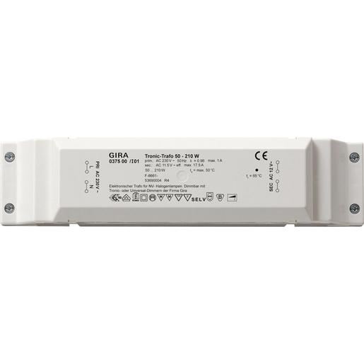 Tronic-Trafo, elektronischer Transformator für NV-Halogenlampen 12 V50 – 210 WMerkmale: Dimmbar mit Gira Tronic-Dimmer oder Gira Universaldimmer. Kurzschlussfest. Mit Schraubklemmen.Hinweise : Sicherheitstransformator nach VDE 0712 24.