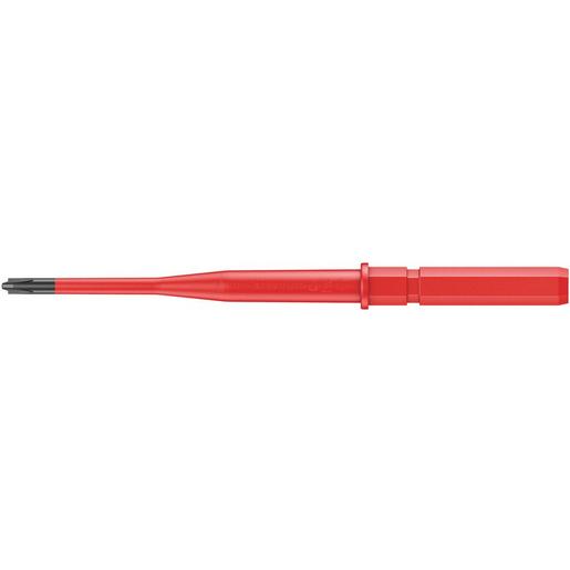 Wechselklinge mit reduziertem Klingendurchmesser mit integrierter Schutzisolation, so können tiefliegende Schraub- und Federelemente erreicht und betätigt werden. Kombinationsprofil Schlitz und Phillips, vor allem zur Verwendung bei Reihenklemmen, Sicherungskästen, Schaltern, Relais. Stückgeprüfte Werkzeuge gem. IEC 60900. Stückprüfung im Wasserbad bei 10.000 V für sicheres Arbeiten bei der zugelassenen Spannung von 1.000 V. Die Wera Black Point-Spitze bietet Passgenauigkeit und optimierten Korrosionsschutz.
