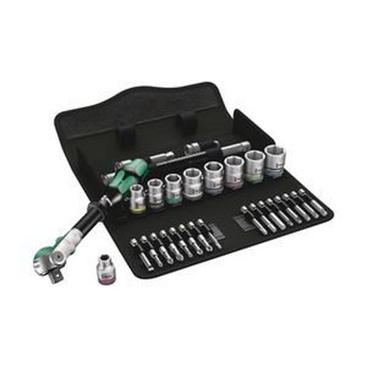 Ratchet Spanner Set, Typ=05004046001, Stück=29 Stück, Kopftyp=Phillips Pozidriv Torx Sechskant, Mixed Ratchet Set Content=1x Ratchet Spanner 9x Metric Sockets 2x Extension Bars 1x Adapter 3x Phillips Bits 3x Pozidriv Bits 5x Torx Bits 4x Hex Bits, Ratchet Handle=Ergonomic, Bit Head Size=PH1 PH2 PH3 PZ1 PZ2 PZ3 T20 T25 T27 T30 T40 H4 H5 H6 H8, Drive Size=3/8″, Ratchet Socket Size Metric=8 mm 10 mm 12 mm 13 mm 15 mm 16 mm 17 mm 18 mm 19 mm