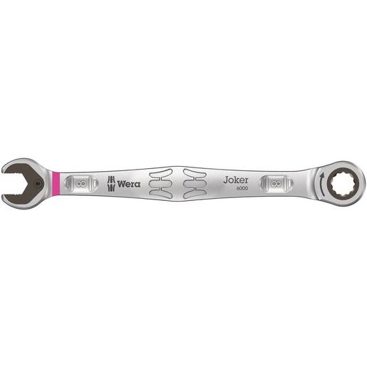 Hochwertiger, metrischer Ringratschen-Maulschlüssel von Wera: Alles, was ein Schlüssel können muss. Und noch viel mehr. Schneller, besser, schöner. Eben ein echter Joker. Die neue Generation der Maul-Ringratschen-Schlüssel. Für Sechskant-Schraubenköpfe bzw. -Muttern. Mit Haltefunktion durch Metallplatte im Maul, die die Gefahr des Verlierens von Schrauben und Muttern reduziert. Die auswechselbare Metallplatte im Maul sichert mit extra harten Zähnen Schrauben und Muttern und reduziert die Abrutschgefahr. Der integrierte Endanschlag kann das Abrutschen vom Schraubenkopf nach unten verhindern und ermöglicht das Aufbringen hoher Drehmomente. Die Doppelsechskantgeometrie sorgt für die formschlüssige Verbindung mit Schraube oder Mutter und damit für die Verringerung der Abrutschgefahr. Ein Rückschwenkwinkel von nur 30° auf der Maulseite vermeidet zeitintensives Wenden des Schlüssels beim Schrauben. Ratschenmechanik auf der Ringseite mit außergewöhnlich hoher Feinverzahnung von 80 Zähnen für Flexibilität auch in engen Bauräumen. Die spezielle Schmiedegeometrie sorgt für hohe Drehmomentübertragung und hohe Biegungssteifigkeit. Gefertigt aus leistungsfähigem Chrom-Molybdän-Stahl mit Nickel-Chrom Beschichtung für hohen Korrosionsschutz. Mit Werkzeugfinder „Take it easy“: Farbkennzeichnung nach Größen.