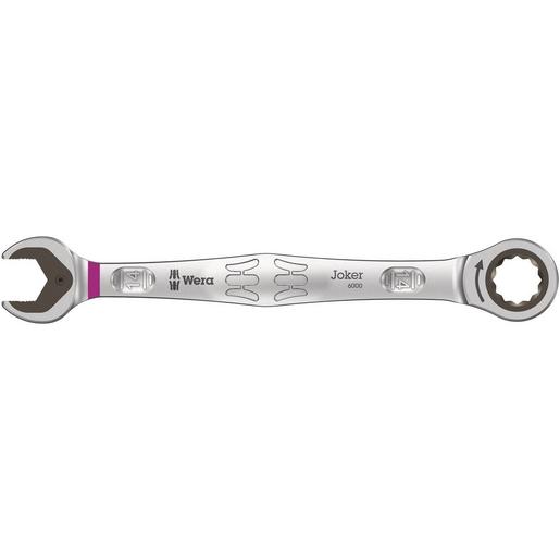 Hochwertiger Ringratschen-Maulschlüssel von Wera: Alles, was ein Schlüssel können muss. Und noch viel mehr. Schneller, besser, schöner. Eben ein echter Joker. Die neue Generation der Maul-Ringratschen-Schlüssel. Für Sechskant-Schraubenköpfe bzw. -Muttern. Mit Haltefunktion durch Metallplatte im Maul, die die Gefahr des Verlierens von Schrauben und Muttern reduziert. Die auswechselbare Metallplatte im Maul sichert mit extra harten Zähnen Schrauben und Muttern und reduziert die Abrutschgefahr. Der integrierte Endanschlag kann das Abrutschen vom Schraubenkopf nach unten verhindern und ermöglicht das Aufbringen hoher Drehmomente. Die Doppelsechskantgeometrie sorgt für die formschlüssige Verbindung mit Schraube oder Mutter und damit für die Verringerung der Abrutschgefahr. Ein Rückschwenkwinkel von nur 30° auf der Maulseite vermeidet zeitintensives Wenden des Schlüssels beim Schrauben. Ratschenmechanik auf der Ringseite mit außergewöhnlich hoher Feinverzahnung von 80 Zähnen für Flexibilität auch in engen Bauräumen. Die spezielle Schmiedegeometrie sorgt für hohe Drehmomentübertragung und hohe Biegungssteifigkeit. Gefertigt aus leistungsfähigem Chrom-Molybdän-Stahl mit Nickel-Chrom Beschichtung für hohen Korrosionsschutz. Mit Werkzeugfinder „Take it easy“: Farbkennzeichnung nach Größen.
