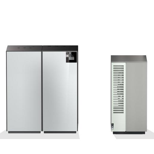 Heizungs-Wärmepumpe zum Heizen bestehend aus einer innen aufgestellten Hydraulikeinheit und einem Außenmodul, die über eine Last-, Kommunikations- und Kältemittelleitung (Sonderzubehör) verbunden werden. Radikal kleine Außeneinheit mit seitlichem Luftausblas zur wandnahen Aufstellung (0,5 m Wandabstand) und langsam laufendem, natürlich leisem EC-Eulenflügel-Ventilator. In der Hydraulikeinheit sind die folgenden Komponenten integriert und betriebsfertig verdrahtet: Integrierte Netzwerkverbindung zur optionalen Steuerung über Smart Device Master-Unit mit einfacher Bedienung über Touch-Display Pufferspeicher und doppelt differenzdruckloser Verteiler für störungsfreien Betrieb Rohrheizung, elektrisch umschaltbar, mit 2,4 oder 6 kW zur optionalen Unterstützung im Heizbetrieb Hocheffizienz-Umwälzpumpe für den Erzeuger- und Verbraucherkreis (EEl ? 0,2) Ausdehnungsgefäß mit 24 l und Sicherheitsventil Schmutzfänger, Durchfluss- und Drucksensor sowie Vor- und Rücklauffühler Außenfühler (Norm NTC-2) im Lieferumfang Optionale Erweiterungsmöglichkeiten: Nebenstehender Design-Warmwasserspeicher mit 220 l Bilvalenter Betrieb in Verbindung mit einem fossilen Wärmeerzeuger Regenerativer Betrieb (z. B. Holz oder Solarthermie) zusätzlicher Heizkreis