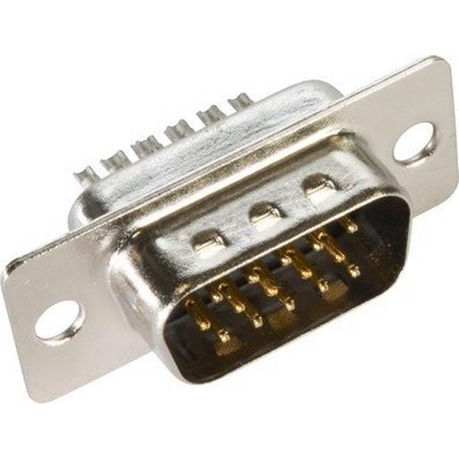 Steckverbinder, Lötkelchanschluss, Bemessungsstrom: 2 A, Stift, Baugröße: D-Sub 1, Thermoplastischer Formstoff, glasfaserverstärkt (PBTP), Shell: Stahl, vernickelt, schwarz, Kontakte: 15, Leiterquerschnitt: 0,25 mm², Kupferlegierung, Edelmetall über Ni steckseitig, Sn über Ni anschlussseitig
