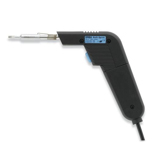 ERSA Schnell-Lötpistole Multi-SprintDer ERSA Multi-Sprint ist eine äußerst leichte, trafolose Lötpistole mit bis zu 150 W Anheizleistung und ergonomischem Design. Sein PTC-Heizelement sorgt in Verbindung mit der innenbeheizten ERSADUR-Dauerlötspitze für einen besonders hohen Wirkungsgrad. Aufgrund der sehr kurzen Anheizzeit ist er ideal für schnelle Einzellötungen geeignet. Der Multi-Sprint erhält nur so lange Heizenergie wie sein Taster gedrückt wird. Die große Spitzenauswahl der Serien 832 / 842 eröffnet ihm nicht nur im Service- und Reparaturbereich ein breites Einsatzspektrum.Ausgestattet mit einer meißelförmigen ERSADUR-Dauerlötspitze.