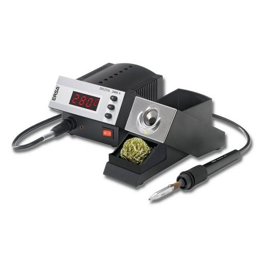 ERSA Digital 2000 A mit Power toolDie DIG2000 ist eine intelligente, mikroprozessorgeregelte Lötstation, die sich durch Ihre Flexibilität und Multifunktionalität auszeichnet. Sie ist nach MIL-SPEC/ESA antistatisch ausgeführt.Die Station ist für den Anschluß der folgenden Lötkolben ausgelegt: Tech tool, Micro tool, Power tool, X-TOOL und für die Entlötpinzette CHIP tool. Die Werkzeuge werden automatisch beim Einstecken in die Station erkannt, und dadurch das Regelverhalten der Station auf dieses Tool angepaßt. Die Lötspitzen bzw. die Entlöteinsätze sind dabei stets hochohmig mit der Potentialausgleichsbuchse verbunden. Diese Tatsache macht die DIG2000 zu einem universellen „Allrounder“.Neben der Multifunktionalität stellt die einfache und anwenderfreundliche Bedienung der Station ein weiteres Highlight dar.Die enthaltenen Funktionen sind die Sollwerteinstellung, die Umschaltung der Temperatureinheit zwischen °C und °F, das Einstellen einer Standby-Zeit von 0 – 60 Minuten, eine Offset- und Kalibrierfunktion, sowie die Verriegelung sämtlicher Einstellmöglichkeiten über ein 3-stelliges Passwort. Die „Energy Funktion“ gestattet dem Anwender das Regelverhalten der Station zu beeinflussen, wodurch das Auf- und Nachheizverhalten der Station auf das jeweilige Einsatzgebiet angepaßt werden kann.Zur Steigerung des Bedienkomforts besitzt die Station 4 Programme. Jedes Programm kann mit den oben aufgeführten Funktionen frei voneinander und unterschiedlich konfiguriert werden. Dabei ist jedem anschließbaren Kolben ein festes Programm zugeordnet. Bei einem Kolbenwechsel wird automatisch von der Station das Programm gewechselt. Dadurch ist ein optimaler Einsatz in Verbindung mit dem Tool Selector möglich. Wird nur ein Kolben eingesetzt, so können natürlich auch alle Programme für diesen einen Kolben genutzt werden.Die Temperaturregelung erfolgt durch einen digitalen PID Algorithmus. Dieser ist auf eine sehr genaue und schnelle Temperaturregelung optimiert.Der ERSA Power tool eignet sich aufgrund seiner kräftigen 290 Watt Anheizleistung (105 W bei 280°C) besonders für Lötstellen mit erhöhtem Wärmebedarf. Dank des extrem grossen Sortiments an ERSADUR-Dauerlötspitzen der Serien 0832 und 0842 ist der Power tool jedoch vor allem ein echter Allrounder. Die 0DIG20A84 besteht aus einer Elektronikstation mit Netzkabel, einem Lötkolben ERSA Power tool mit Lötspitze und einem Ablageständer mit Viskose- und Trockenschwamm aus Metallwolle.