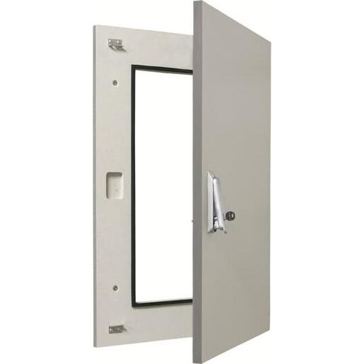 Brandschutz-Vorsatztür, Baureihe VF, für den Innenbereich, mit Blendrahmen und Tür, Schutzart IP54, Baustoff nach A2 – nicht brennbar, geprüft nach DIN 4102-1, rauchdicht, Feuerwiderstand 30 min geprüft nach DIN 4102-2, Brandlastdämmung 30 min in Anlehnung an DIN 4102-11, Funktionserhalt 30 min in Anlehnung an DIN 4102-12, oberflächenbeschichtet, in RAL AEHNLICH7035, einflüglige Tür, Tür aus nicht brennbarem Material, mit Schwenkhebel mit Halbzylinder, Türöffnungswinkel 180 Grad, Türanschlag rechts, Abmessungen in mm (H x B x T): 895 x 575 x 51, Blendrahmenmaße in mm (H x B x T): 895 x 575 x 22, Rasteinheit 4 RE, Bauhöhe 0, Feldbreite 1, Platzeinheiten 48