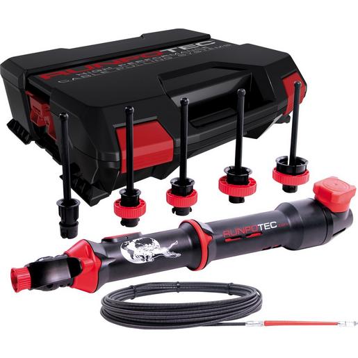 RT 2008 Basisgerät mit 5 Steckaufsätzen, 1 Steckkupplungen, 1 Gürtelklipp und 15m RUNPOGLEITER Spirale MET im Systemkoffer von RUNPOTEC kompatibel zu Sortimo. Einsatzgebiet bei Rohr 16mm – 32mm. Der RT 2008 kann nur mit der RUNPOGLEITER Spirale MET betrieben werden. Durch die integrierten Klemmbacken und der Teleskopstange ermöglich der RT 2008 einen unvergleichbaren Vorschub der Spirale. Durch die geradlinige Führung kann die eingesetzte Muskelkraft direkt auf die Einziehspirale übertragen werden. Zusätzlich kann die RUNPOGLEITER Spirale MET mittels der dritten Klemmung und dem Ratschen-Griff in Drehung versetzt werden. Das ermöglicht auch bei engen Radien und längeren Distanzen einen kontinuierlichen Vorschub. Ab Längen von 20m empfiehlt RUNPOTEC die Unterstützung durch eine Akkubohrmaschine.
