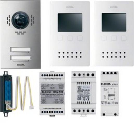 VEA-2EM VideoSet 2 Teilnehmer AP 2D-Video Edelstahl/weiß ESTA/BVF-560. Aufputz Video-Set als Elektronikpaket für Sprechanlage/Intercom nach DIN EN 50486 in 2Draht-Video-Technik. Video-Set bestehend aus Innenstation mit Video-Innenstation (Unterputz), Außentürstation mit Kamera/Türelektronik-Kombination (Aufputz), Tastenexpander, Strangversorgung, Video-Netzgerät und Netztransformator. AP-Außentürstation mit 2 mm dicken Frontplatte aus Edelstahl matt gebürstet mit Lochsprechöffnungen, Lautsprecher, Kamera, Tasterleiste, flächenbündiges Namensschild (von vorn wechselbar) mit LED-Beleuchtung und AP-Gehäuse 35 mm Tiefe. Farb-Einbaukamera mechanisch verstellbar (Schwenkbereich 174 Grad) mit automatische Umschaltung von Farbe auf S/W-Betrieb bei Dunkelheit (Infrarotbeleuchtung), integrierter Lautsprecher und Mikrofon-/Lautstärkeregler. Video-Innenstation mit weißer Designblende, LCD-Farbdisplay, frontseitiger Lautsprecher, Kamera, Touchsensor-Tasten und UP-Kasten.