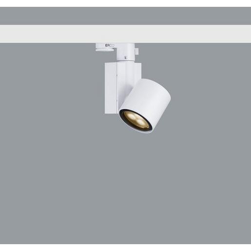 Weiß (RAL9002) LED 6W 600lm 3000K Warmweiß Dimmbar Version 3 Anschlussleistung 8W Spherolitlinse flood Zylindrischer Leuchtenkopf: Aluminiumguss, pulverbeschichtet. 270° schwenkbar. Gehäuse: Kunststoff, am 3-Phasen-Adapter 360° drehbar. Elektronisches Betriebsgerät, dimmbar. Potentiometer zur Helligkeitsregelung. ERCO 3-Phasen-Adapter: Kunststoff. LED-Modul: Hochleistungs-LEDs auf Metallkern-Leiterplatte. SDCM<2. CRI>90. L80/B10 50000h. Kollimatoroptik aus optischem Polymer. Dimmen mit externen Dimmern (Phasenabschnitt) möglich. Dimmbereich 1%-100% Gewicht 0,50kg Energieeffizienzklasse EEI A+ ENEC10, VDE, CCC+S+E, GOST, Schutzklasse II