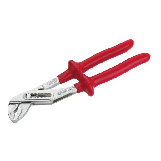 Mit zweifarbigen, ergonomischen Kunststoff-Griffhüllen in moderner 2-Komponenten- Technologie: Gute Griffigkeit durch rutschfeste, nicht klebende Oberfläche auch bei Nässe und Schmutz, Isolierung bei extremen Temperaturen, elektrischen Schlägen und Vibrationen sowie Beständigkeit gegen Schweiß, Salzwasser, Öl und viele Chemikalien. Wasserpumpenzange DIN ISO 8976, aus Chrom-Vanadium-Stahl, mit Brennerloch und Doppelrillen-Gleitgelenk, 5fach verstellbar, 1000V, 250mm lang