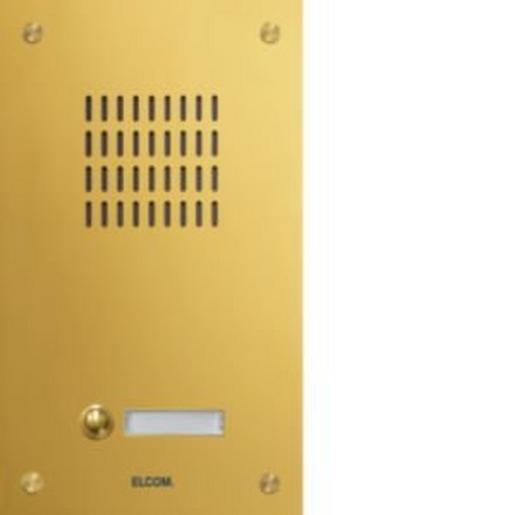 TMG-1/1 Aussenstation für Türlautsprecher 1/1 Rund-Taster UP PVD-messing ESTA. Unterputz Audio-Türstation für Sprechanlage/Intercom nach DIN EN 50486. Bestehend aus einer 2 mm dicken Frontplatte aus Edelstahl, poliert und veredelt mit witterungsbeständiger PVD-Messing-Beschichtung, Lochsprechgitter, runder Klingeltaster, Spezialschrauben, Namensschild (von vorn wechselbar) mit LED-Beleuchtung, Türlautsprecherhalterung mit Schnellmontage und UP-Gehäuse 55 mm Tiefe. Hinweis: Passende Elektronik und Lautsprecher erforderlich.