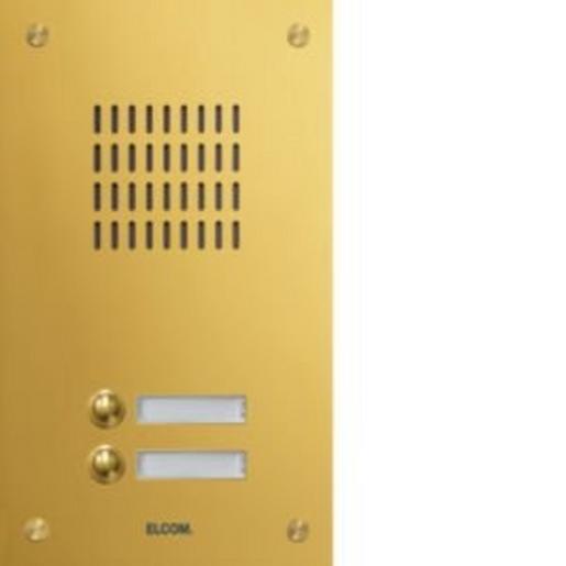 TMG-2/1 Aussenstation für Türlautsprecher 2/1 Rund-Taster UP PVD-messing ESTA. Unterputz Audio-Türstation für Sprechanlage/Intercom nach DIN EN 50486. Bestehend aus einer 2 mm dicken Frontplatte aus Edelstahl, poliert und veredelt mit witterungsbeständiger PVD-Messing-Beschichtung, Lochsprechgitter, runder Klingeltaster, Spezialschrauben, Namensschild (von vorn wechselbar) mit LED-Beleuchtung, Türlautsprecherhalterung mit Schnellmontage und UP-Gehäuse 55 mm Tiefe. Hinweis: Passende Elektronik und Lautsprecher erforderlich.