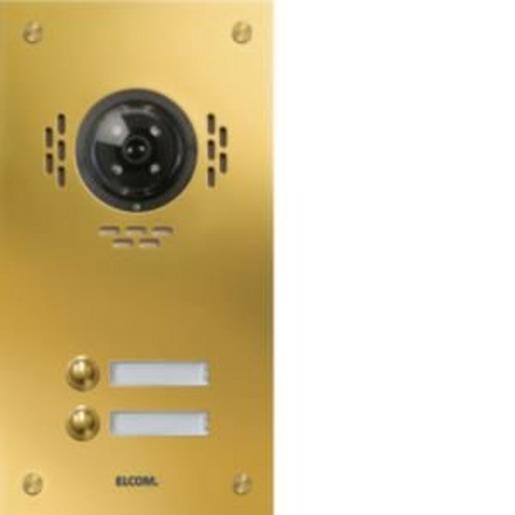 TMG-2/1 Aussenstat. für Kamera-Türlautsprecher 2/1 Rund-Taster UP PVD-mess. ESTA. Unterputz Video-Türstation für Sprechanlage/Intercom nach DIN EN 50486. Bestehend aus einer 2 mm dicken Frontplatte aus Edelstahl, poliert und veredelt mit witterungsbeständiger PVD-Messing-Beschichtung, mit Lochsprechöffnungen, runder Klingeltaster, Spezialschrauben, Namensschild (von vorn wechselbar) mit LED-Beleuchtung, Video-Vorbereitung und UP-Gehäuse 55 mm Tiefe. Hinweis: Passende Elektronik und Lautsprecher erforderlich.