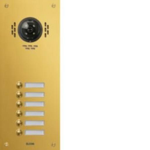 TMG-6/1 Türstation für Kamera-Türlautsprecher 6/1 Rund-Taster UP PVD-mess. ESTA. Unterputz Video-Türstation für Sprechanlage/Intercom nach DIN EN 50486. Bestehend aus einer 2 mm dicken Frontplatte aus Edelstahl, poliert und veredelt mit witterungsbeständiger PVD-Messing-Beschichtung, mit Lochsprechöffnungen, runder Klingeltaster, Spezialschrauben, Namensschild (von vorn wechselbar) mit LED-Beleuchtung, Video-Vorbereitung und UP-Gehäuse 55 mm Tiefe. Hinweis: Passende Elektronik und Lautsprecher erforderlich.