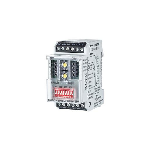 Das BACnet MS/TP-Modul mit 4 analogen Eingängen wurde für dezentrale Schaltaufgaben entwickelt. Es können Ströme und Spannungen, von z. B. aktiven Temperaturfühlern, elektrischen Lüftungs- und Mischklappen, Ventilsteuerungen usw., erfasst werden. Jeder Eingang kann per DIP-Schalterpaar auf der Frontseite entweder als Strom- oder Spannungseingang eingestellt werden. Mit einen BACnet-Client können die Eingänge über Standard-Objekte abgefragt werden. Die Einstellung der Moduladresse und der Bitrate erfolgt über zwei Drehschalter auf der Frontseite. Geeignet zur dezentralen Montage auf Tragschiene TH35 nach IEC 60715 in Elektroverteilern.Anschluss mit Schraubklemmen
