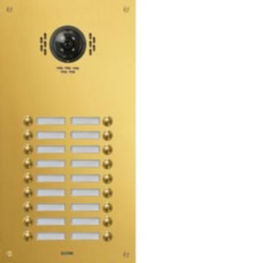 TMG-18/2 Aussenstation für Kamera-Türlautsp. 18/2 Rund-Taster UP PVD-mess. ESTA. Unterputz Video-Türstation für Sprechanlage/Intercom nach DIN EN 50486. Bestehend aus einer 2 mm dicken Frontplatte aus Edelstahl, poliert und veredelt mit witterungsbeständiger PVD-Messing-Beschichtung, mit Lochsprechöffnungen, runder Klingeltaster, Spezialschrauben, Namensschild (von vorn wechselbar) mit LED-Beleuchtung, Video-Vorbereitung und UP-Gehäuse 55 mm Tiefe. Hinweis: Passende Elektronik und Lautsprecher erforderlich.