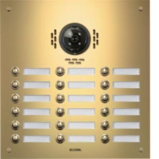 TMG-18/3 Aussenstation für Kamera-Türlautsp. 18/3 Rund-Taster UP PVD-mess. ESTA. Unterputz Video-Türstation für Sprechanlage/Intercom nach DIN EN 50486. Bestehend aus einer 2 mm dicken Frontplatte aus Edelstahl, poliert und veredelt mit witterungsbeständiger PVD-Messing-Beschichtung, mit Lochsprechöffnungen, runder Klingeltaster, Spezialschrauben, Namensschild (von vorn wechselbar) mit LED-Beleuchtung, Video-Vorbereitung und UP-Gehäuse 55 mm Tiefe. Hinweis: Passende Elektronik und Lautsprecher erforderlich.