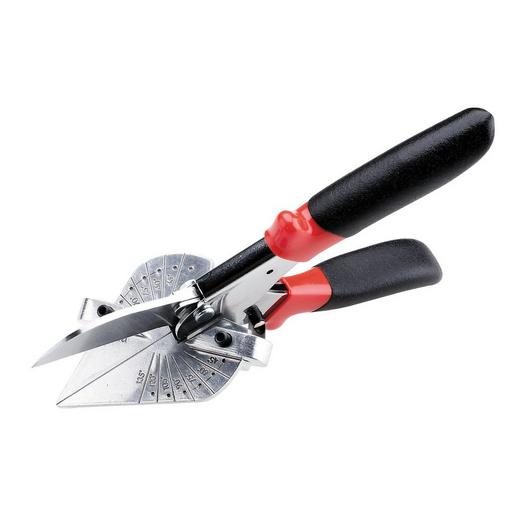 Kunststoffschere mit variablem Anschlag, Schere wie aus Sortiment Nr. 12 0210, jedoch mit verstellbarem Anschlagwinkel für Komfortable Gehrungsschnitte, Rast-Positionen in 45 Grad, 60 Grad, 75 Grad, 90 Grad, 105 Grad, 120 Grad und 135 Grad, 2-Komponenten-Griffe