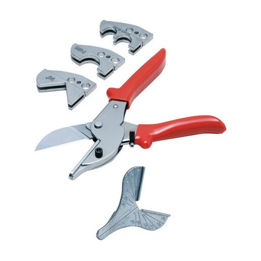Vielzweckschere für Kunststoffe, praktisches Set, bestehend aus Qualitätsschere und 5 auswechselbaren Schneideeinsätzen, in schlagfester, handlicher Kunststoffbox, unentbehrlich bei nahezu allen handwerklichen Arbeiten in der Elektro- und Sanitärinstallation, Vielzweckschere für schnelle, quetschfreie Schneidarbeiten an Kunststoff-, Gummi-, Holzteilen und Flachbandkabeln (außer harte Metalle), massive Präzisions-Schneidklinge (Schnittlänge 57mm) aus einsatzgehärtetem Werkzeugstahl (> 52 HRC), schleifbar, besondere Schneidengeometrie für sehr leichten Schnitt, exzentrisch gelagerter Drehpunkt für ziehenden Schnitt macht lästiges Entgraten überflüssig, mitÖffnungsfeder und Feststeller, ergonomisch geformte Kunststoff-Handgriffe mit Abgleitschutz, 5 verschiedene Schneidauflagen aus Leichtmetall, in Sekundenschnelle auswechselbar: flach-gerader Einsatz (ist in der Schere vormontiert) für allgemeine Schneidarbeiten an flachen Materialien wie Kunststoffprofilen, Flachkabel, Kabelkanäle, Fußbodenleisten usw. , Gehrungseinsatz mit Anschlagewinkel und Markierungen für winklige Schnitte 45 Grad-60 Grad-75 Grad-90 Grad-105 Grad-120 Grad, Profileinsatz 90 Grad für das Schneiden von Kastenprofilen bis 25x45mm, z. B. kleine Kabeldurchmesserund Leitungsführungskanäle, sowie für harte oder dickwandige Kunststoffrohre und Schläuche bis 25mm Durchmesser, Rundprofileinsatz 16/19 mm mit je einer Rundführung 16mm (5/8)- und 25mm (3/4)- Durchmesser sowie Rundprofileinsatz 25mm mit einer Rundführung 25mm, ideal zum gratfreien Schneiden von flexiblen und harten Kunststoffrohren und Schläuchen