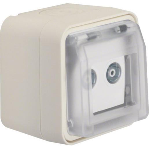 Antennen-Steckdose 2Loch Einzeldose AP W.1 polarweiß. Antennen-Steckdose 2-Loch mit Klappdeckel AP, Einzeldose, IP55. Für analoge und digitale Übertragung. Für terrestrischen Empfang, mit 2 Leitungseinführungen, mit Schraubklemmen, vollflächige Dichtung unter dem Gehäuseboden zur Abdichtung der Gehäuserückseite, mit transparentem, zufallendem Klappdeckel, manuell einrastbar, um den Schutzgrad IP55 zu erreichen, gut zugängliche, trichterförmige Montagelöcher in den Gehäusen, einfache Montage des Einsatzes im Rahmen mit Klappdeckel durch Einrasten, sichere Fixierung des Rahmens mit Klappdeckel am Gehäuse über Bajonett-Schnellverschluss.