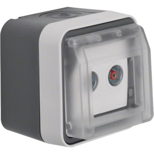 Antennen-Steckdose 2Loch Durchgangsdose AP W.1 grau. Antennen-Steckdose 2-Loch mit Klappdeckel AP, Durchgangsdose, IP55. Für analoge und digitale Übertragung. Für terrestrischen Empfang, mit 2 Leitungseinführungen, mit Schraubklemmen, vollflächige Dichtung unter dem Gehäuseboden zur Abdichtung der Gehäuserückseite, mit transparentem, zufallendem Klappdeckel, manuell einrastbar, um den Schutzgrad IP55 zu erreichen, gut zugängliche, trichterförmige Montagelöcher in den Gehäusen, einfache Montage des Einsatzes im Rahmen mit Klappdeckel durch Einrasten, sichere Fixierung des Rahmens mit Klappdeckel am Gehäuse über Bajonett-Schnellverschluss.