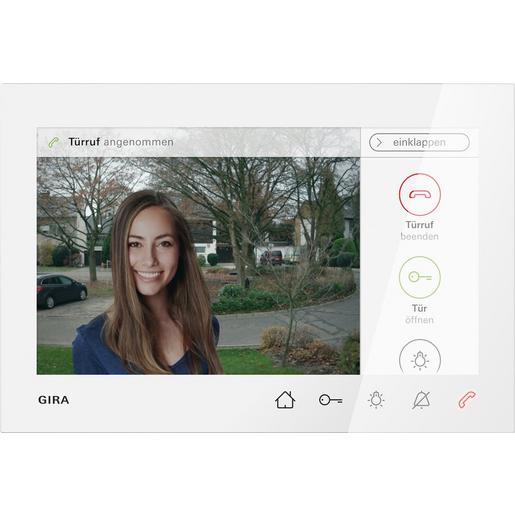 Wohnungsstation Video AP 7 Reinweiß glänzend Merkmale: Komplett vormontierte Einheit mit einem 17,78 cm (7″) großen TFT-Farbdisplay und komfortabler Freisprechfunktion. Vollflächige Glasfront mit Touchfunktionalität und taktiler Rückmeldung. Direkte Wandmontage oder Wandmontage mit Unterputz-Gerätedose bzw. Hohlwanddose. Montage mit Standfuß für Platzierung auf Möbelstücken.
