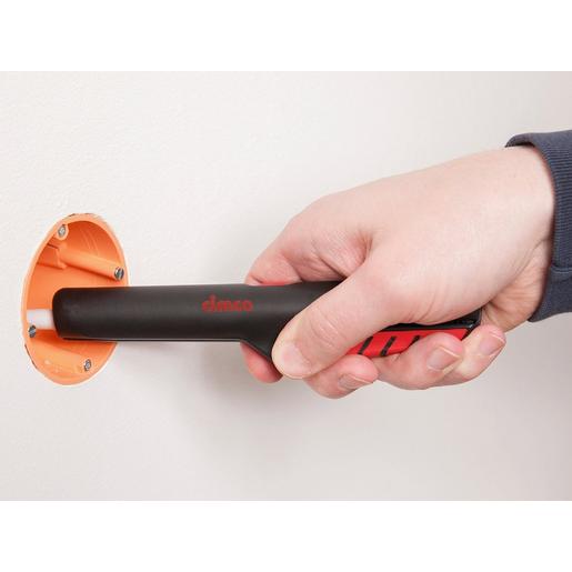 Der CIMCO-lnnendosen-Stab-Entmanteler ist hervorragend für Arbeiten in Geräte- und Abzweigdosen geeignet. Die auf die tiefen Gerätedosen abgestimmte Werkzeuglänge bietet dem Anwender einen besonderen Komfort: Das Arbeiten vor der Gerätedose ist bequem möglich und das Kabel kann ohne Probleme abisoliert werden. Die Finger haben genügend Abstand zur scharfkantigen Dosenöffnung und die Griffzone mit Weichkomponenten bietet genügend Kraftübertragung an die Werkzeugspitze. Die Einstellung der Schnitttiefe auf den jeweiligen Durchmesser ist nicht notwendig, da die vier speziell geformten Klingen sich auf das jeweilige Rundkabel automatisch einstellen. Innendosen-Stab-Entmanteler. Für alle gängigen Rundkabel von 8 – 13 mm Durchmesser. Titan-Nitrid beschichtete Klingen garantieren höchste Standzeit und eine sehr gute Gleitfähigkeit. Sicherer Halt durch ergonomische, rutschsichere 2-Komponenten-Griffzone, Vier-Klingen-Anordnung reduziert Kraftaufwand und erhöht Präzision. Beschriftungsfeld vereinfacht die Personalisierung des Entmantelers, Längenskalierung, TÃ?V/GS-geprüft