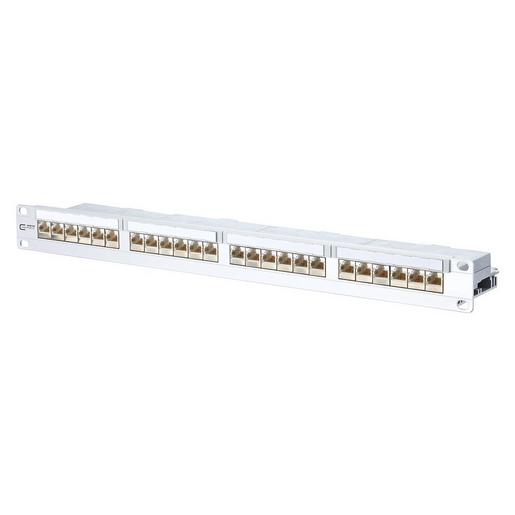 19 Zoll 1HE Träger aus silber eloxiertem Aluminium, mit 24 einzelgeschirmten RJ45-Buchsen, Cat.6, A Komponentenprüfung nach ISO/IEC 11801, DIN EN 50173-1, ANSI/TIA-568.2-D und IEC 60603-7-51, GHMT zertifiziertEinhaltung der Klasse E, A bis 500 MHz nach ISO/IEC 11801, DIN EN 50173-1getestet: Komponente bis 600 MHz, Link bis 800 MHz, für 10 GBit Ethernet (IEEE 802.3an), Remote Powering (PoE, PoE plus, UPoE und 4PPoE) und HDBaseT geeignet, vier Modulgehäuse aus Zinkdruckguss mit je sechs RJ45-Buchsen, die Adernpaare können ohne Aufdrehen der Verseilung bis zur LSA-Klemme geführt werden, Anschluss der 2- bis 4-paarigen Datenleitungen an LSA-Schneidklemmen (AWG 26/1-22/1). Mit Kennzeichnung der Adernfarben nach T568A.Sichtfenster für beiliegende Beschriftungseinlagen, zusätzliche Zugentlastung mittels Kabelbinder möglich, Module mittels Erdschiene verbunden, inkl. 30 cm Erdungskabel