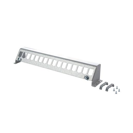 Modulhalterung leer zur Aufnahme von Daten-, KOAX- und LWL-Modulen, Einbauform: Modul, Montage auf Hutschiene (TH35) oder auf Traggerüst bzw. Montageplatte schraubbar, 3-teilig: Bestehend aus 1 Modulhalter aus gebogenem Blech und 2 gefrästen Kunststoffhalterungen universal einsetzbar für alle Varianten, Montage der Kunststoffhalterungen auf Hutschiene und Lochblech, Funktionspotentialausgleich nach DIN EN 50310 (VDE0800-2-310) mit 2 Schraubbefestigungen möglich über Erdungsschraube M6x10 mit Mutter und Zahnscheibe, 1 Beschriftungsstreifen auf Modulhalterung, Varianten: 12, 16, 24 Port
