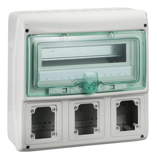 Kaedra wetterfestes Aufputzgehäuse mit der Möglichkeit von verschiedenen Einbauten, 3 Montagestellen für Steckdosen 90x100mm, 12+1 TE für Reiheneinbaugeräte. IP-Schutzklasse – IP65. Es können alle Arten von modularen Reiheneinbaugeräte installiert werden und es gibt Platz für die installation von Industrie- oder Haushaltssteckdosen, Taster oder Kontrollleuchten. Das Gehäuse ist mit einer transparenten grünen Tür für modulare Reiheneinbaugeräte ausgestattet. Die Farbe des Gehäuses ist hellgrau (RAL 7035). Es ist für die Neuinstallation oder Renovierung in Wohn-/Zweckgebäuden oder auch vielen anderen Bereichen vorgesehen. Die Kabel können über vorgestanzte Öffnungen an der Ober- oder Unterseite des Gehäuses eingeführt werden. 1 Klemmenblock wird mitgeliefert. Die Anschlussklemmen haben 8 Abgänge. Das Gehäuse hat die Schutzklasse II und ist bis zu einem Nennstrom von 63A zugelassen.