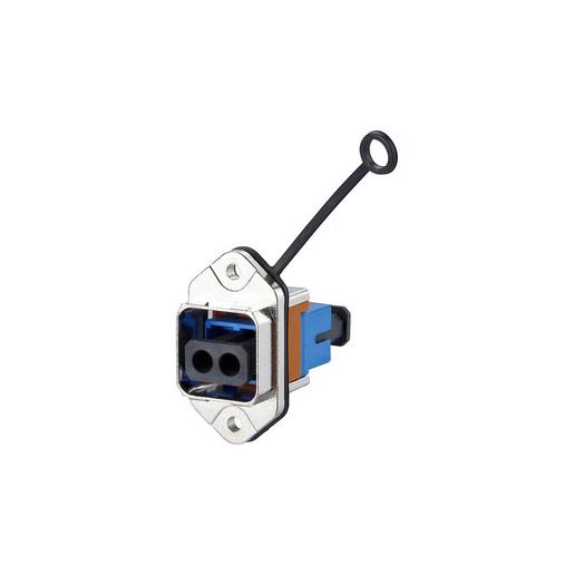 Flansch mit Push-Pull-Verschluss nach Norm ISO/IEC 24702 und IEC 61076-3-117 Var. 14, LWL Kupplung aus Kunststoff, Führungshülse aus Zirkonoxydkeramik (ZrO2) geschlitzt für Singlemode Anwendungen, Führungshülse aus Metall (Ph-Br) geschlitzt für Multimode Anwendungen, Einhaltung der EN 50173-1:2011-09 bzw. ISO/IEC 24702 bezüglich der Grenzwerte für Einfügungsdämpfung, Kunststoffgehäuse und Staubschutzkappen der Kupplung flammwidrig und halogenfrei, einfach zu montieren durch Normbefestigung mit zwei Schrauben (M3), frontseitig montierbar, industrietaugliches Metallgehäuse mit erhöhter Robustheit, Brennbarkeitsklasse nach UL 94V-0, bessere Chemikalienbeständigkeit