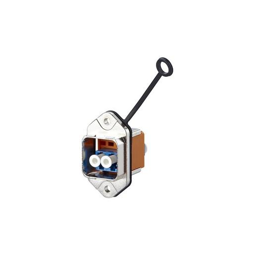 Flansch mit Push-Pull-Verschluss nach Norm ISO/IEC 24702 und IEC 61076-3-117 Var. 14, LWL Kupplung aus Kunststoff, Führungshülse aus Zirkonoxydkeramik (ZrO2) geschlitzt für Singlemode Anwendungen, Führungshülse aus Metall (Ph-Br) geschlitzt für Multimode Anwendungen, Einhaltung der EN 50173-1:2011-09 bzw. ISO/IEC 24702 bezüglich der Grenzwerte für Einfügungsdämpfung, Kunststoffgehäuse und Staubschutzkappen der Kupplung flammwidrig und halogenfrei, einfach zu montieren durch Normbefestigung mit zwei Schrauben (M3), frontseitig montierbar, industrietaugliches Metallgehäuse mit erhöhter Robustheit, Brennbarkeitsklasse nach UL 94V-0, bessere Chemikalienbeständigkeit