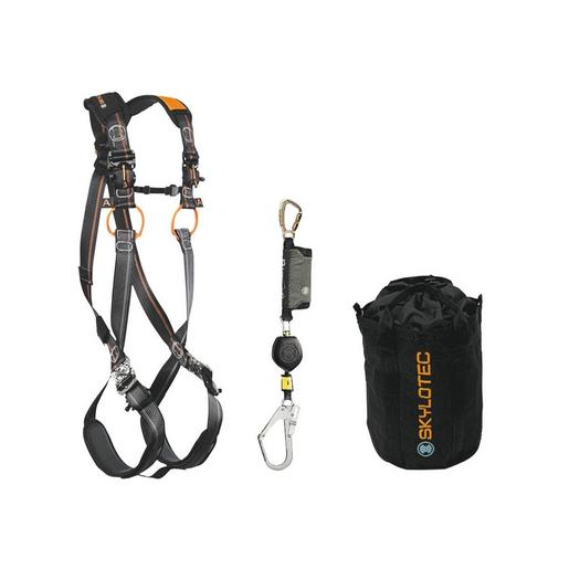 Sicherheits-Set Standard 1. flexibel einsetzbares Set mit einem Auffanggerät, das durch einen federgelagerten Rückzugsmechanismus die Fallstrecke so kurz wie möglich hält, Auffanggurt mit zusätzlichen Polstern und einer Tragkraft von bis zu 140 kg. Im praktischen Rope Bag sind enthalten: Auffanggurt, bis 140 kg (EN 361/358), Auffanggerät, 2,5 m, mit vorderer und hinterer Anschlagmöglichkeit