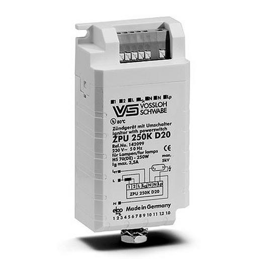 Zündgerät mit Leistungsumschalter für HS-Lampen 70 (DE) bis 250 WZur Zündung und Leistungsreduzierung von Natriumdampf-Hochdrucklampen (HS)Gehäuse: PCSteuerspannung: 230 VEin- und Abschaltspannung: 170-198 VPhasenlage des Zündimpulses: 60-90 °el und 240-270 °elMax. zul. Gehäusetemperatur: 80 °CSteckklemmen: 0,75-1,5 qmmBefestigung: Gewindebolzen mit vormontierter Zahnscheibe und MutterFür Leuchten der Schutzklasse I und IIFür positive Schaltlogik einsetzbarunter Beachtung der Anschlussbelegung des Leistungsumschalters.für garantierten Volllastanlauf der LampeUmschaltung auf Leistungsreduzierung erfolgt nach einer Umschaltzeit (Schaltverzögerung)von ca. 5 Minuten.