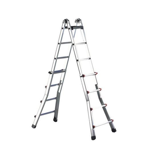 Höhenverstellbare Aluminium-Teleskop-Leiter, inklusive Traverse. Flexibel einsetzbare 3-in-1-Aluminium-Sprossenleiter, nutzbar als Anlege-, Schiebe- oder Stehleiter. Beide Leiternseiten sind getrennt voneinander von Sprosse zu Sprosse ausschiebbar, dadurch auch Einsatz auf geneigten Aufstellflächen und Treppen möglich. Leicht, handlich, einfach zu bedienen und in professioneller Ausstattung und Verarbeitung. Optimale Standsicherheit durch Gummifüße, kräftige Automatik-Gelenke aus Aluminium. Absolut sicheres und komfortables Arretieren der Leiter durch 4 Sperrelemente mit Federbolzen, Rasthaken und Abdeckungen aus bruchsicherem Kunststoff. Mit praktischem Kunststoff-Werkzeughalter 310 x 260 mm. Durchgehend geriffelte, verbördelte Aluminiumsprossen, Sprossenquerschnitt 27 x 27 mm, Sprossenabstand 280 mm), inkl. Traverse, geprüft gemäß EN 131.