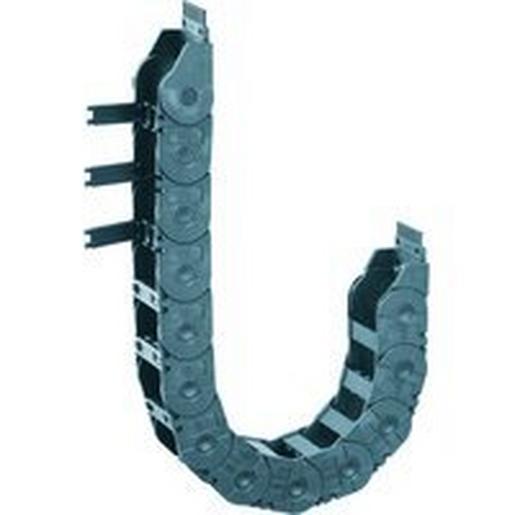 Im Außenradius aufklappbare stabile E-Kette® mit großen Zubehörbaukasten und guter freitragender Länge