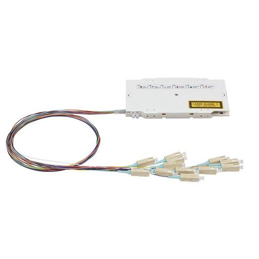 OpDAT VS 12xSC OM3 Crimp Vorkonfektionierte Standard-Spleisskassette zum Einbau inPatchfelder, bestueckt mit 12 Pigtails, einemCrimpspleissschutzhalter und rastbarem Kassettendeckel. ZumAnspleissen von LWL Innen- oder Aussenkabeln. Pigtails:Stecker: SC gemaess IEC 61754-20, Gehaeuse beige, Knickschutzaqua,mit transparenter StaubschutzkappeAder: 0,9 mm Kompaktader (I-V, STB), Primaer- undSekundaer-Coating gleichgefaerbt, abisoliert undspleissfertig eingelegt in Spleisskassette. Farblichsortiert nach IEC 60304 (rot, gruen, blau, gelb, weiss,grau, braun, violett, tuerkis, schwarz, orange, rosa). (IEC11801), IEC 60793-2-10 A1a.2, ITU-T G.651.1Pigtaillaenge ausserhalb der Spleisskassette kaskadiertzwischen 80cm (rot, gruen) und 90cm (orange, pink).Einfuegedaempfung: max. 0,4 dB gegen Master (IEC 61300-3-4,MethodeB), bei 850 und 1300 nm gemessen. 100% geprueft.Rueckflussdaempfung: min. 35 dB (IEC 61300-3-6).Nach Messung abschliessende visuelle Pruefung der Steckernach IEC61300-3-35. Standard-Spleisskassette mit Deckel:Einbaumass: LxHxT 154,50 x 92 x 10 mm Etikett mit Seriennummer in Spleisskassette eingeklebt undPruefprotokoll beigelegt. Metall und Kunststoffteile recyclingfaehig, RoHS-konform,Nachweise des Herstellers sind beizufuegen.