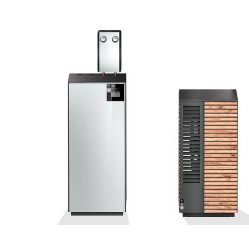Heizungs-Wärmepumpe zum Heizen und Kühlen mit Inverter-Regelung bestehend aus einer innen aufgestellten Hydraulikeinheit und einem Außenmodul, die über eine Last-, Kommunikations- und Kältemittelleitung (Sonderzubehör) verbunden werden. Die Regelung passt über einen Inverter die Wärmepumpenleistung an den tatsächlichen Heiz- bzw. Warmwasserbedarf an. Radikal kleine Außeneinheit mit seitlichem Luftausblas zur wandnahen Aufstellung (0,5 m Wandabstand) und langsam laufendem, natürlich leisem EC-Eulenflügel-Ventilator. In der Hydraulikeinheit sind die folgenden Komponenten integriert und betriebsfertig verdrahtet: Integrierte Netzwerkverbindung zur optionalen Steuerung über Smart Device Master-Unit mit einfacher Bedienung über Touch-Display Pufferspeicher und doppelt differenzdruckloser Verteiler für störungsfreien Betrieb Rohrheizung, elektrisch umschaltbar, mit 2,4 oder 6 kW zur optionalen Unterstützung im Heizbetrieb Hocheffizienz-Umwälzpumpe für den Erzeuger- und Verbraucherkreis (EEl ? 0,2) Ausdehnungsgefäß mit 24 l und Sicherheitsventil Schmutzfänger, Durchfluss- und Drucksensor sowie Vor- und Rücklauffühler Außenfühler (Norm NTC-2) im Lieferumfang Optionale Erweiterungsmöglichkeiten: Nebenstehender Design-Warmwasserspeicher mit 220 l (XL) oder 355 l (XXL) Bivalenter Betrieb in Verbindung mit einem fossilen Wärmeerzeuger Regenerativer Betrieb (z. B. Holz oder Solarthermie) zusätzlicher Heizkreis