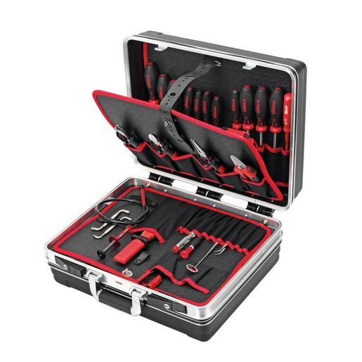 Werkzeugkoffer mit Werkzeugsortiment Klassik Elektronik komplett mit 21 Werkzeugen. Werkzeugkoffer-Bestückung: 1 x Telefonzange, gerade (10 0216), 1 x Seitenschneider 160 mm (10 0574), 1 x Lackabzieher (10 0712), 1 x Abisolierzange Super 4 (10 0760), 1 x Elektronik-Seitenschneider (10 1040), 1 x Mikro-Elektronik-Spitzzange (10 1076), 1 x Pinzette (10 3016), 1 x Winkelschraubendreher Schlitz (11 0620), 1 x Winkelschraubendreher PH 1 / PH 2 (11 0630), 1 x Festhalteschraubendreher Schlitz (11 0784), 1 x Phasenprüfer (11 1280), 1 x Kontrollspiegel (11 1600), 1 x Kombi-Krallengreifer (11 1650), 1 x Präzisions-Schlitz-Schraubendreher (11 1864), 1 x Sechskant-Steckschlüssel SW 5,5 (11 7205), 1 x Sechskant-Steckschlüssel SW 7 (11 7207), 1 x Sechskant-Steckschlüssel SW 8 (11 7208), 1 x Sechskant-Steckschlüssel SW 10 (11 7210),1 x Schlitz-Schraubendreher mit 1000 V-Schutzisolation 3,0 x 0,5 (11 7702), 1 x Schlitz-Schraubendreher mit 1000 V-Schutzisolation 4,0 x 0,8 (11 7704), 1 x Schlitz-Schraubendreher mit 1000 V-Schutzisolation 5,5 x 1,0 (11 7705), 1 x Kreuzschlitz-Schraubendreher mit 1000 V-Schutzisolation PH 1 (11 7731), 1 x Kreuzschlitz-Schraubendreher mit 1000 V-Schutzisolation PH 2 (11 7732), 1 x Kreuzschlitz-Schraubendreher mit 1000 V-Schutzisolation PZ 1 (11 7741), 1 x Kreuzschlitz-Schraubendreher mit 1000 V-Schutzisolation PZ 2 (11 7742), 1 x Kabelschere Duocut ( 12 0108), 1 x Universalschere 190 mm ( 12 0122), 1 x 1000 V Sicherheitskabelmesser (12 1042), 1 x Kabelmesser System 4 -70 (12 2016)