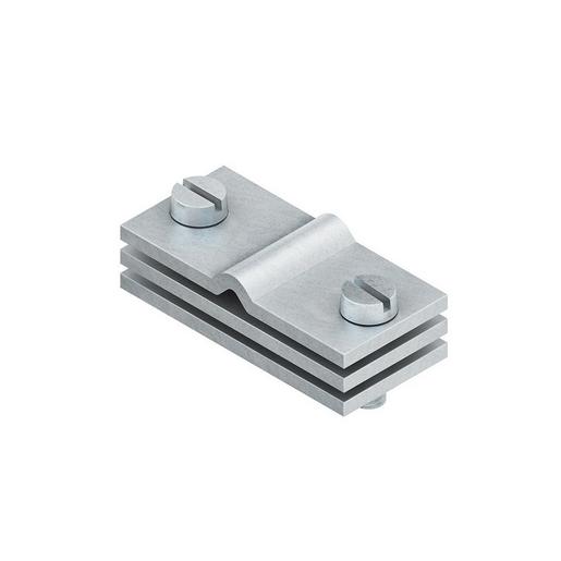 Anschlussklemme, mit Zylinderkopfschrauben nach DIN EN ISO 1207, für die Verwendung in trockenen Innenräumen, für den oberirdischen Anschluss von Erdungsleitungen. Abmessung (ca. Maße) Klemmplatten B x L x t : 25 x 54 x 3 mm Abmessung (ca. Maße) Zwischenplatte B x L x t : 25 x 54 x 3 mm für Leiterquerschnitte : 10 mm² – 35 mm² Werkstoff Verbinder : Stahl, galv.verz. Werkstoff Schrauben : Stahl, galv.verz.