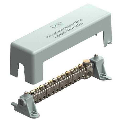 Potentialausgleichsschiene für den Potentialausgleich nach DIN VDE 0100-410/-540 sowie Blitzschutzpotentialausgleich nach DIN VDE 0185-305? mit Klemmschiene 10 x 10 mm aus Messing, vernickelt? mit kontaktsicheren Reihenklemmen aus Stahl, galvanisch verzinkt? Abdeckhaube und Schienenböcke aus Polystyrol, grau? Abdeckhaube plombierbar / beschriftbar? blitzstromtragfähig 100 kA (10/350)? Zugbügel mit Schraubensicherung gegen Selbstlockern (z. B. in der Industrie gefordert)Anschlussmöglichkeiten:? 12 ein- oder mehrdrähtige Leitungen 2,5-25 mm² oder feindrähtige Leitungen bis 16 mm² (max. Ø 7 mm)? 1 ein- oder mehrdrähtige Leitungen 25-95 mm² oder feindrähtige Leitungen bis 70 mm² (max. Ø 13,5 mm)