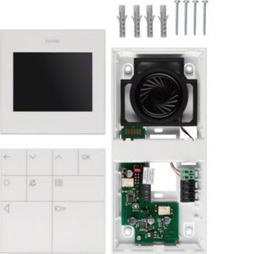BVF-210WS Innenstation Video Standard AP 6D-Video weiß. Video-Innenstation für Sprechanlage/Intercom nach DIN EN 50486 in 6Draht-Video-Technik. Innenstation zum freisprechen (ohne Hörer) für Wandmontage mit TFT-Farb-Display 3,5 Zoll, Touchsensor-Tasten mit Symbolanzeigen und Reinigungsmodus. Bild-Einstellregler für Helligkeit, Kontrast und Farbe. 9 Funktionstasten mit LED: Sprechen Ein/Aus, Türöffner, Licht und Rufton-Absteller. LED-Statusanzeige für Ruf- und Sprechbetrieb. 16 harmonische Ruftöne einstellbar, freie Zuordnung der Ruftonmelodie zu Tür- Etagen oder Internruf, Rufton-Lautstärke in 3 Stufen einstellbar, Ruftonmelodie- und Tastentonlautstärke einstellbar und Ruftonmelodie abstellbar. Halbduplex-Sprechbetrieb temporär und fest einstellbar. Anklopfen-Funktion bei aktiver Verbindung und automatische Gesprächsabschaltung nach 3 Minuten. Automatische Videoeinschaltung bei Ruf, Helligkeit, Farbe und Kontrast einstellbar. Menüsprache in Deutsch, Englisch oder Französisch einstellbar. Sonderfunktionen: manuelle Kameraeinschaltung und Umschaltung bei mehreren Kameras, Internruf für interne Gespräche auf Adressen FF und FE sowie Änderung der Sonderfunktionen über DIP-Schalter sperrbar. Lichttaste z.B. für Treppenhaus- oder Hoflicht. Anschluss für Etagenruf-Klingeltaster und Etagenrufweiterleitung über den an die parallelen Innenstationen. Parallelschaltung von max. 3 Innenstationen. Auch zur Montage auf Gerätedose nach DIN 49073 geeignet. DREHFIX-Funktion: Ein-Mann-Inbetriebnahme durch Adressierung mit Drehcodierschalter.