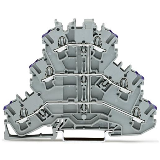 Dreistockklemme 6-Leiter-Durchgangsklemme L ohne Beschriftungsträger für Anwendungen Ex e II geeignet intern gebrückt Leitereinführung violett bedruckt für Tragschiene 35 x 15 und 35 x 7,5 2,5 mm² Push-in CAGE CLAMP® 2,50 mm² grau